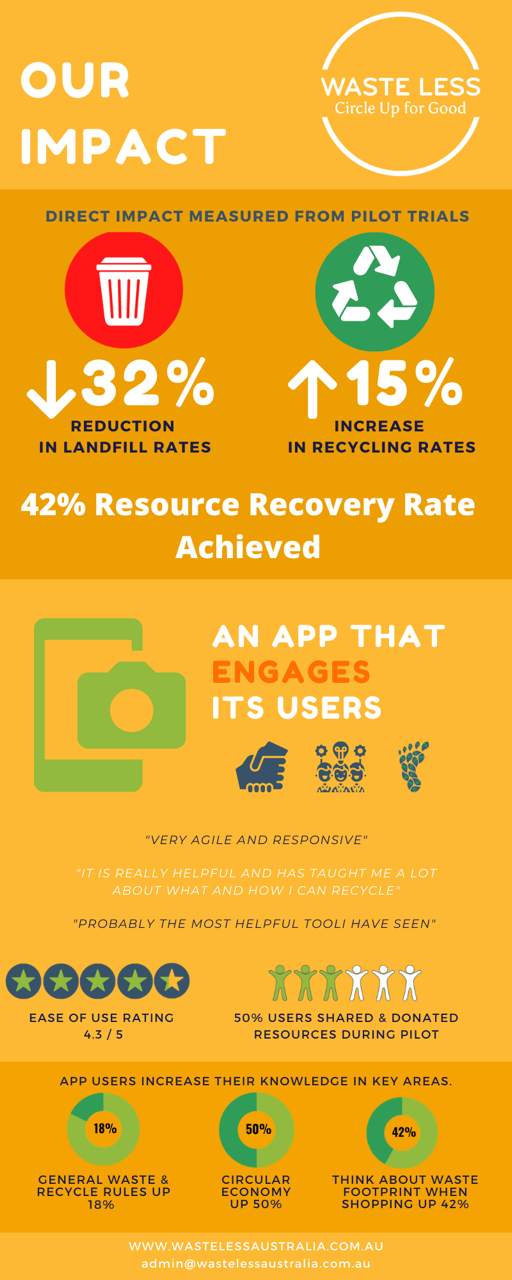 In a trial on the Sunshine Coast hinterland the app helped reduce wastage and increased compliance with recycling. (See the awesome data in the graphic below.) With these impressive results Ryan is ready to pitch his app to councils across Australia and make a real difference.